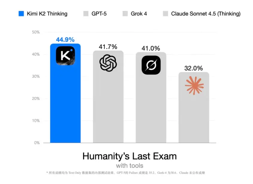 測試結果表明,在允許使用工具——搜索、Python、網絡瀏覽工具的同等情況下,Kimi K2 Thinking 在人類最後的考試(Humanity's Last Exam)這項基準評測中取得了 44.9% 的 SOTA 成績。人類最後的考試是一項涵蓋 100 多個專業領域的終極封閉式學術測試。
