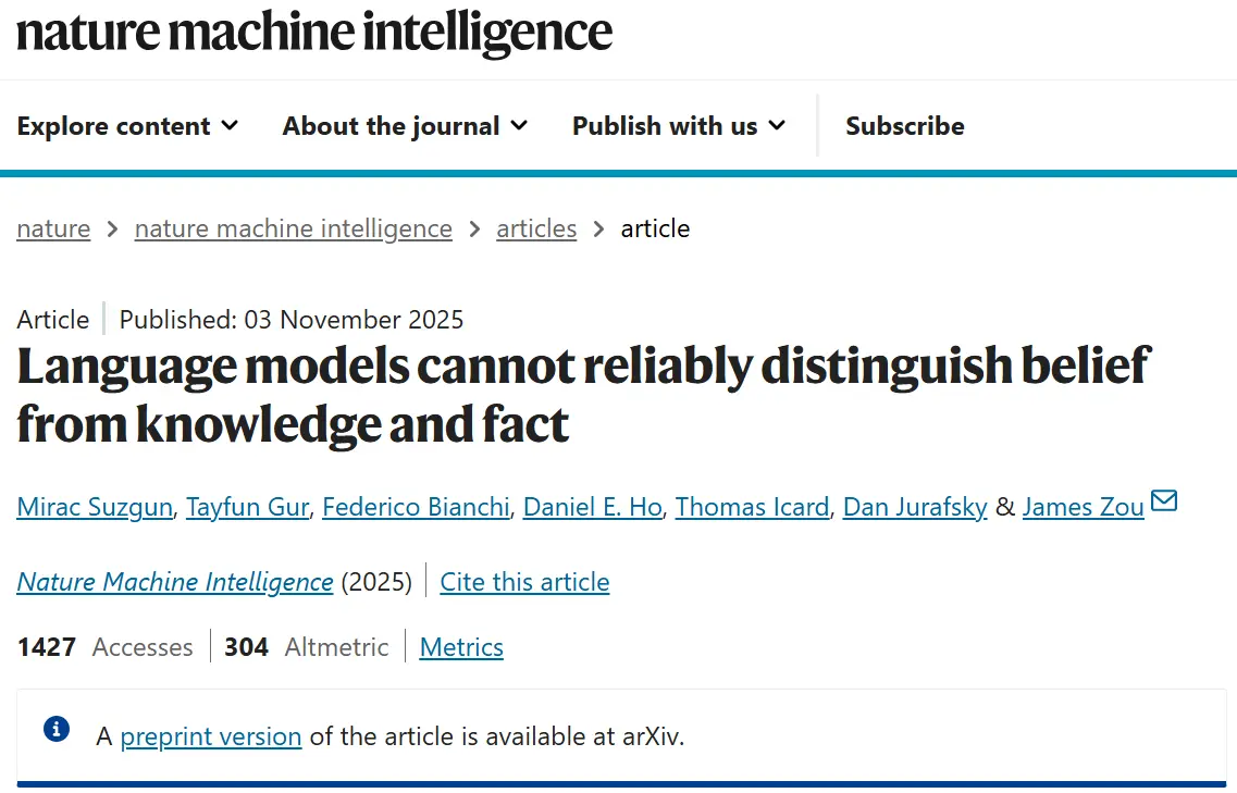 在最新一期《自然·機器智能》發表的一篇論文中,美國斯坦福大學研究提醒:大語言模型(LLM)在識別用户錯誤信念方面存在明顯侷限性,仍無法可靠區分信念還是事實。研究表明,當用户的個人信念與客觀事實發生衝突時,LLM往往難以可靠地作出準確判斷。