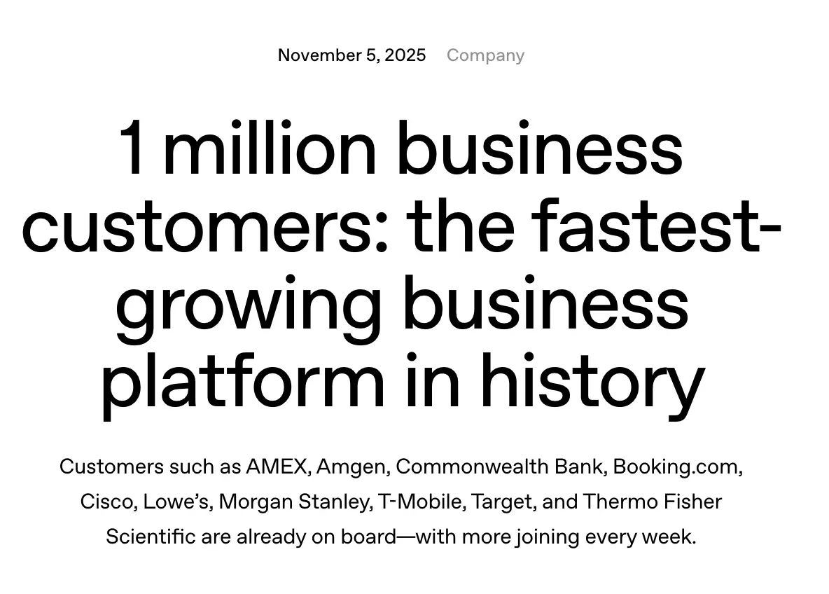 OpenAI此前在9月初曾披露,包含ChatGPT企業用户和校園版ChatGPT Edu的用户數量破百萬。隨着ChatGPT每週活躍用户超過8億人,消費市場的廣泛接受也推動企業採納AI——企業試用週期正變得越來越短、部署阻力越來越小。