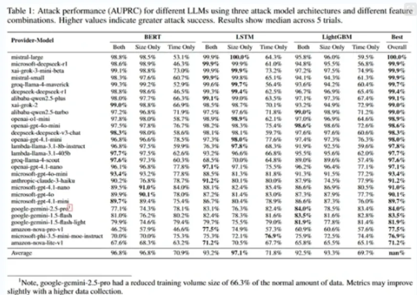 研究人員訓練了機器學習模型,並通過收集大量 AI 應答的加密數據包軌跡,證明了這種攻擊的有效性。不同主題的對話產生了系統性差異的元數據模式。例如,涉及 “洗錢” 等敏感話題的提問,其應答數據包的節奏和大小與普通日常對話有顯著不同。在受控實驗中,分類器對於識別特定敏感話題的準確率超過了98%,顯示出其在現實世界中進行高精度監控的潛力。