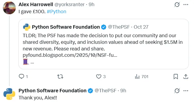 Python 軟件基金會(PSF)近日拒絕了一筆價值 150 萬美元的美國國家科學基金會(NSF)撥款申請,原因是撥款條款中附帶了禁止推進多樣性、公平與包容(DEI)相關項目的限制。PSF 董事會認為該條款與基金會使命背道而馳,決定放棄這筆可能成為其歷史上最大的一筆資助。