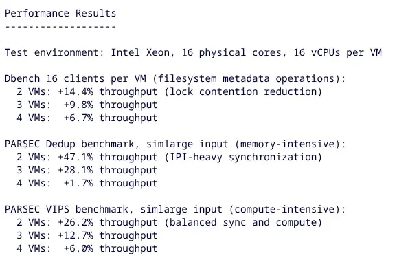 IPI-aware directed yield:當虛擬機內部出現大量同步/中斷操作時,調度器能智能“讓步”,降低等待開銷。