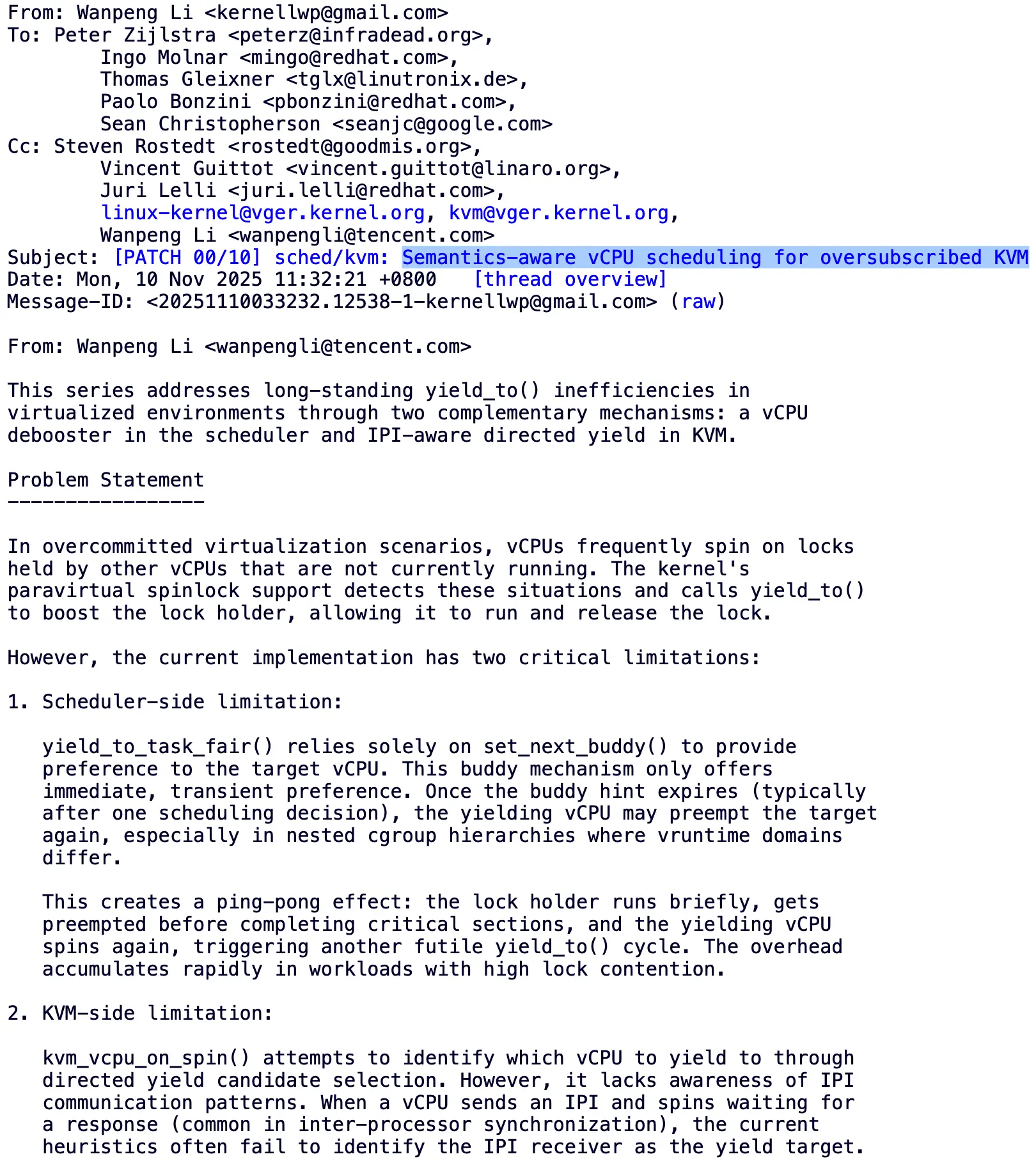 騰訊工程師最近向 Linux 內核社區提交了一套全新的 “語義感知(Semantics-aware)vCPU 調度方案”,專門優化 KVM 虛擬機在 vCPU 超額訂閲(over-subscription) 情況下的性能問題。