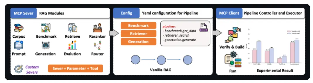區別於傳統RAG的硬編碼模式,UltraRAG2.1基於模型上下文協議(MCP),將檢索、推理、生成等模塊解耦為標準化“智能體”,通過YAML聲明式配置即可靈活組裝複雜任務流。例如,僅需幾行配置,即可實現“先檢索技術文檔→再調用代碼生成模型→最後用評估模塊校驗輸出”的三階段工作流。