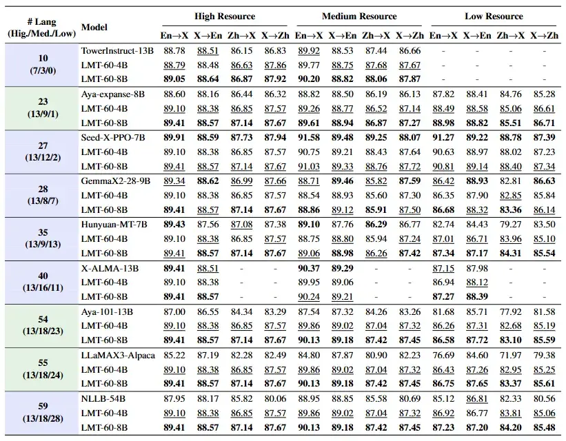 在 FLORES-200 基準上,LMT 在同等語言覆蓋規模的模型中取得了SOTA性能,實現了較廣泛的語言覆蓋度和全面的翻譯能力。