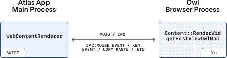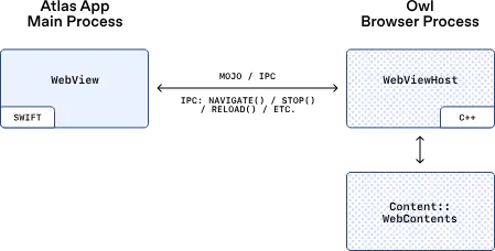 據介紹,OWL架構將Chromium作為獨立進程運行,主應用基於SwiftUI等原生框架構建,兩者通過Mojo(Chromium的IPC系統)通信。