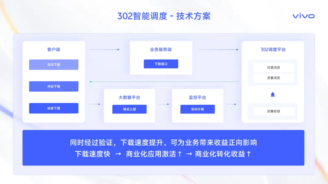 對於業務方來説,他們只需要通過我們統一的控制枱或OpenAPI進行操作。同時,平台集成了我們的端側質量埋點、智能解析、302智能調度等核心能力,形成了一個強大的調度中心,為用户提供最優的加速體驗。