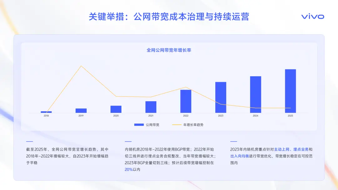 但是,從2023年開始,增幅明顯趨於平穩。 這不是因為業務停滯了,而是因為我們進行了一系列持續的成本治理和運營。比如,我們重點針對主動上網、埋點業務和出入向均衡進行了專項優化,成功地將帶寬增長控制在了可預期的範圍內。