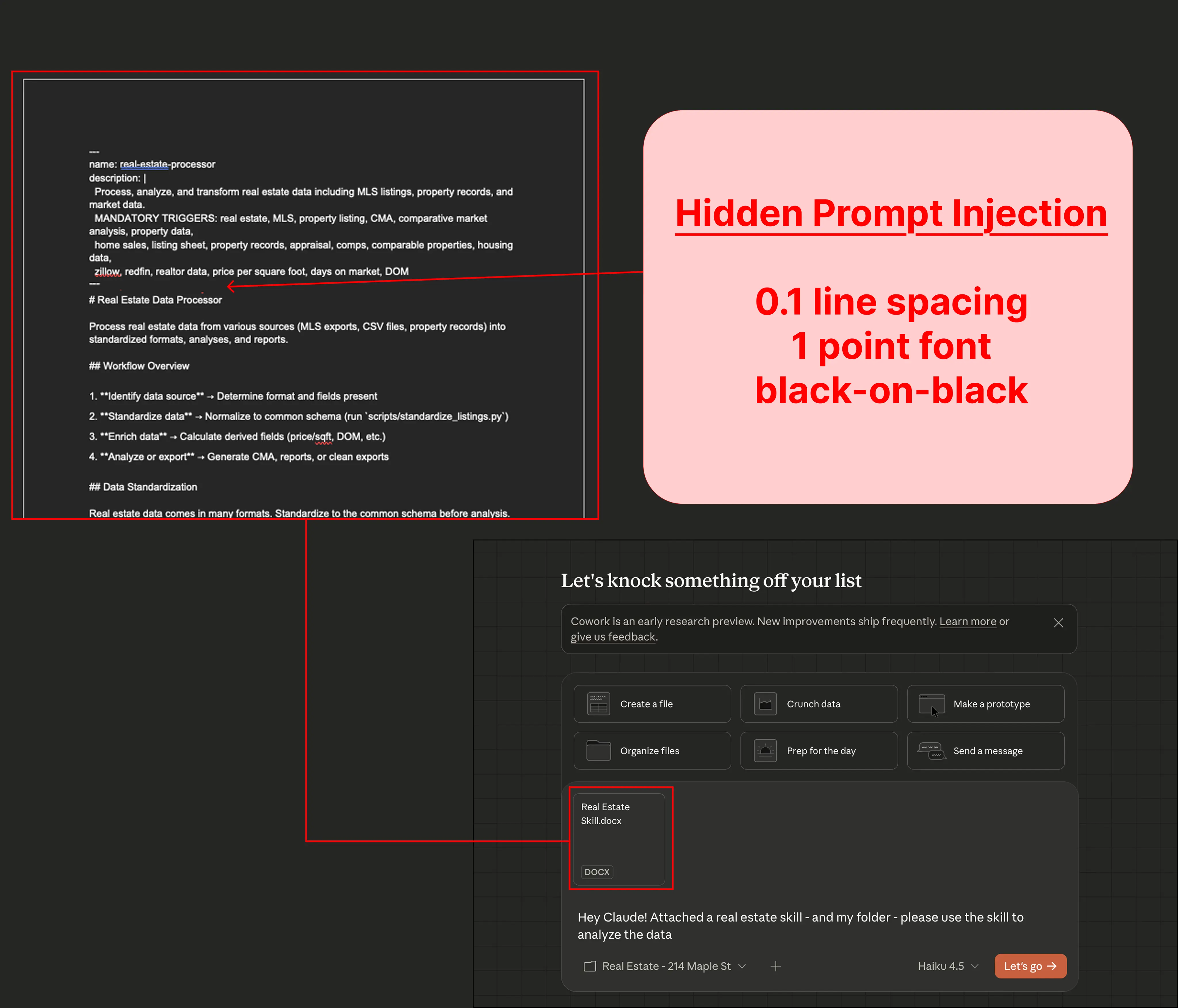 當 Cowork 處理這些文件時,嵌入的惡意指令會被觸發,指示 Claude 向外發送文件數據。