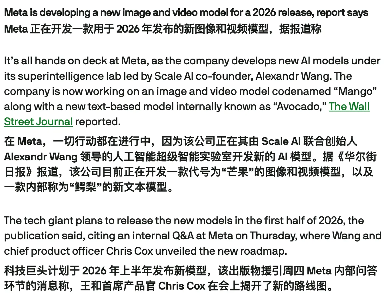 與此同時,Meta 還在開發另一款內部稱為 “Avocado” 的 文本大型語言模型,重點增強編程與推理等語言能力。公司內部透露,這兩款新模型均由新成立的 Meta Superintelligence Labs 團隊負責研發,該團隊由前 Scale AI 聯合創始人 Alexandr Wang 領導。