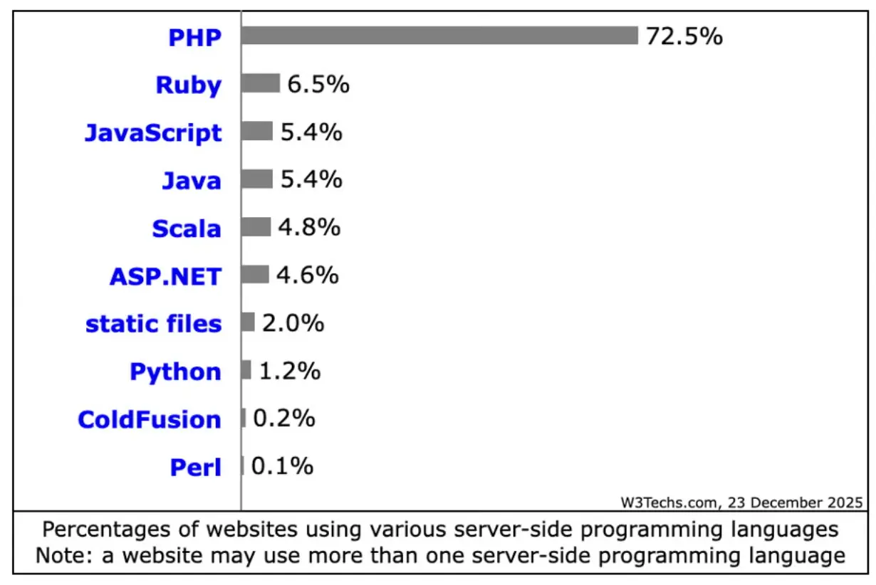 雖然近年來 PHP 的使用率略有下降,但它仍然是服務器端語言中最受歡迎的選擇,遙遙領先於其他語言。