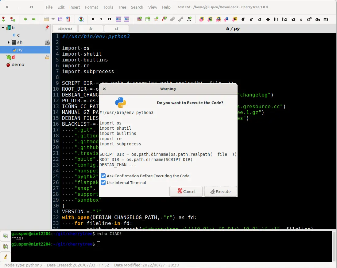 CherryTree 1.6.3 現已發佈。CherryTree 是一個支持無限層級分類的筆記軟件,Python 編寫,支持富文本編輯和代碼高亮,支持 Linux 和 Windows 平台。數據採用 sqlite 或 XML 存儲,支持密碼保護,支持從 NoteCase、KeepNote、Knowit、Tomboy、TuxCards、Treepad、Leo 等筆記軟件導入數據。