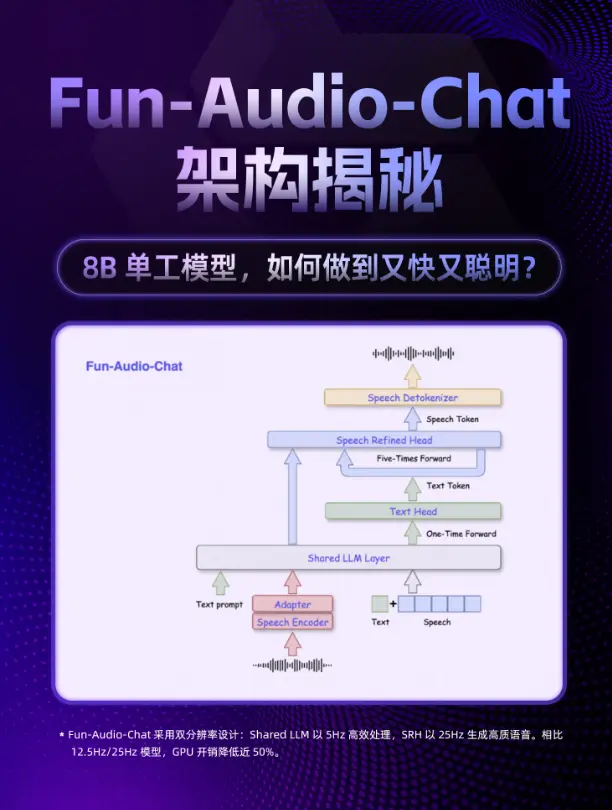 - 雙分辨率設計:Shared LLM 層以 5Hz 幀率 高效處理,SRH 以 25Hz 幀率 生成高質量語音,GPU 計算開銷降低近 50%。