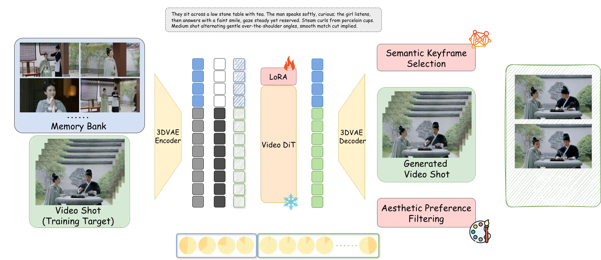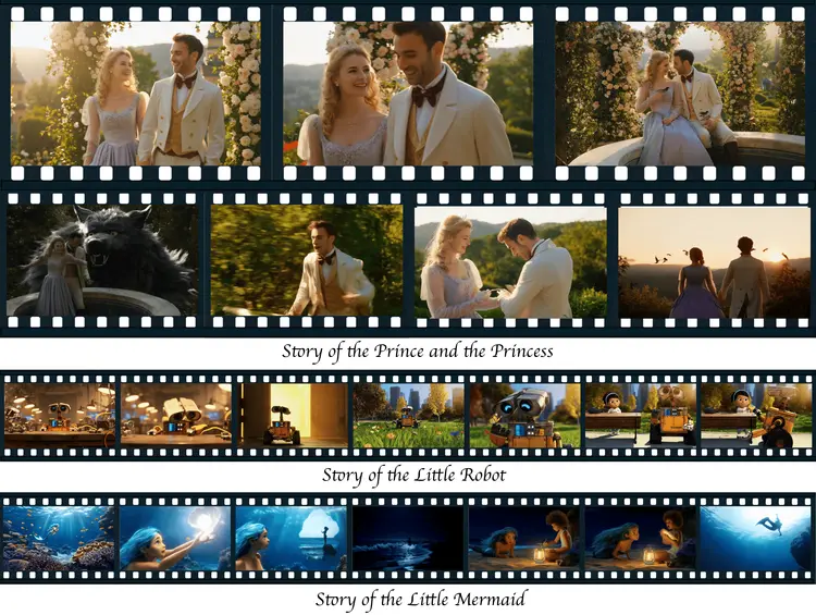 該框架利用動態記憶庫存儲關鍵幀信息,結合輕量LoRA微調,在角色外貌、場景風格和敍事邏輯上實現跨鏡頭高度一致,一致性指標較現有方法提升29%。