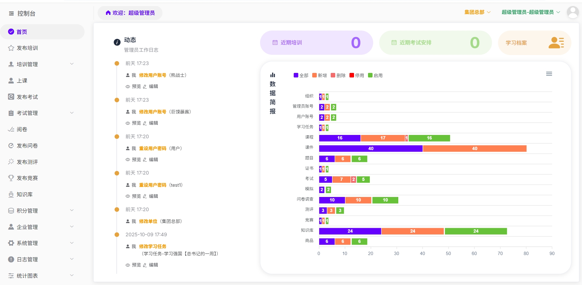 培訓管理:統計分析、學員管理、課程管理、成績管理。
