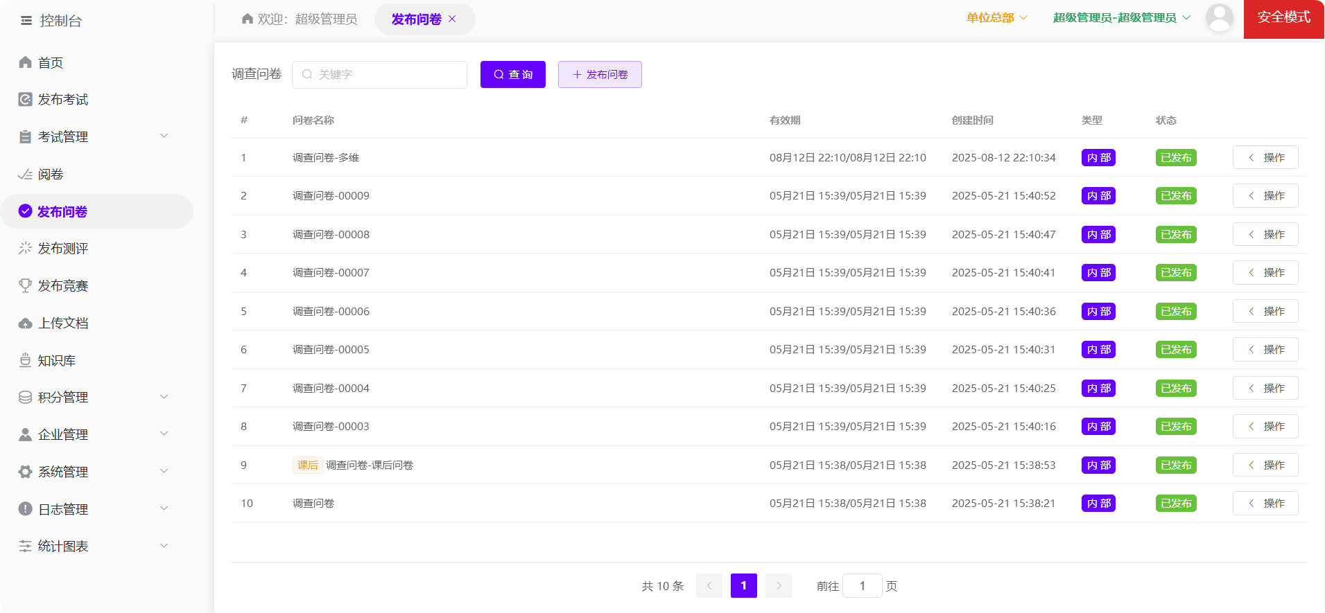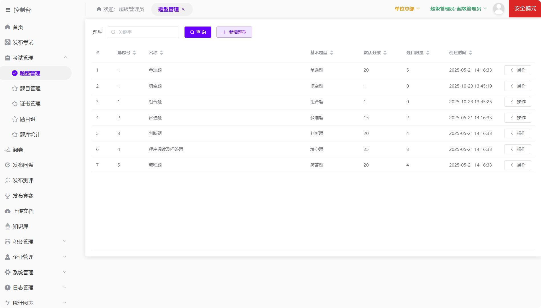 發佈考試:發佈、保存、重新發布試卷,支持正式考試、模擬自測模式。
