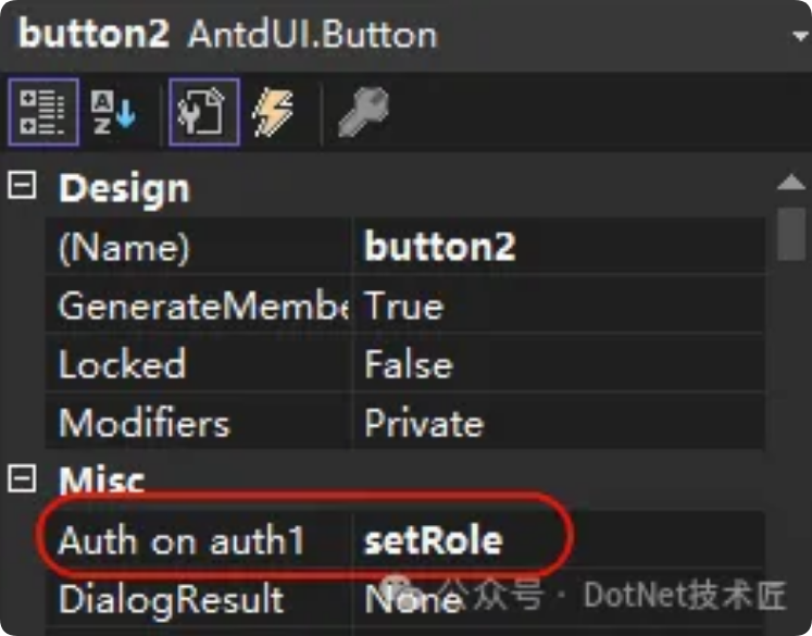 在設計頁面拖入 Auth 控件,然後點擊按鈕,按鈕上就會多一個權限屬性。