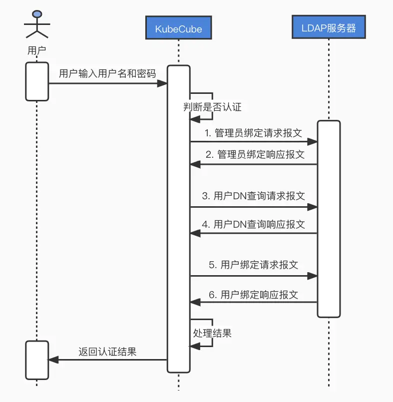- KubeCube 作為 LDAP 客户端,獲取到用户的用户名和密碼,以管理員DN和管理員密碼為參數向 LDAP 服務器發送管理員綁定請求報文以獲得查詢權限。