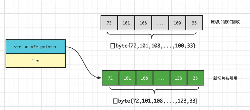 str unsafe.Pointer // 指向一個byte類型的切片指針