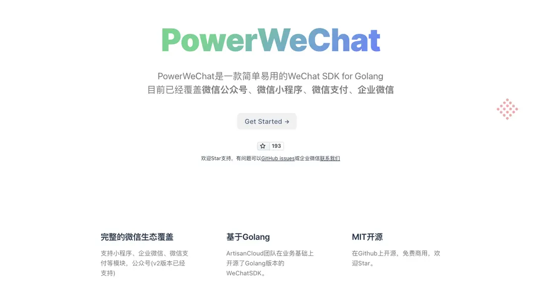 完整的微信生態覆蓋,支持小程序、企業微信、微信支付等模塊,公眾號(v2版本已經支持)。基於Golang,ArtisanCloud團隊在業務基礎上開源了Golang版本的WeChatSDK。MIT開源,在Github上開源,免費商用。
