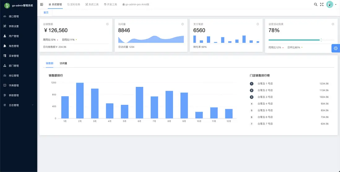 go-admin支持多租户、用户管理、部門管理、菜單管理、角色管理、字典管理、參數管理、操作日誌、登錄日誌、接口文檔、代碼生成、表單構建、服務監控、內容管理、定時任務等相關功能。