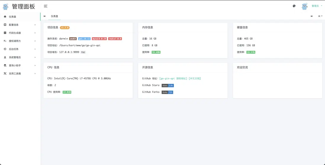 go-gin-api支持 rate 接口限流、支持 panic 異常時郵件通知、支持 cors 接口跨域、支持 Prometheus 指標記錄、支持 Swagger 接口文檔生成、支持 GraphQL 查詢語言、支持 trace 項目內部鏈路追蹤、支持 pprof 性能剖析、支持 errno 統一定義錯誤碼、支持 zap 日誌收集、支持 viper 配置文件解析、支持 gorm 數據庫組件、支持 go-redis 組件、支持 RESTful API 返回值規範、支持 生成數據表 CURD、控制器方法 等代碼生成器、支持 cron 定時任務,在後台可界面配置、支持 websocket 實時通訊,在後台有界面演示、支持 web 界面,使用的 Light Year Admin 模板等功能。