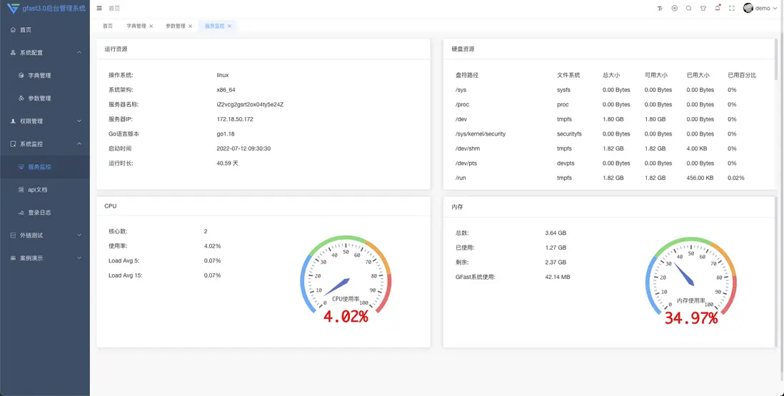 gfast內置用户管理、部門管理、崗位管理、菜單管理、角色管理、字典管理、參數管理、操作日誌、登錄日誌、在線用户、定時任務、代碼生成、服務監控、在線構建器、文件上傳,緩存標籤等功能。