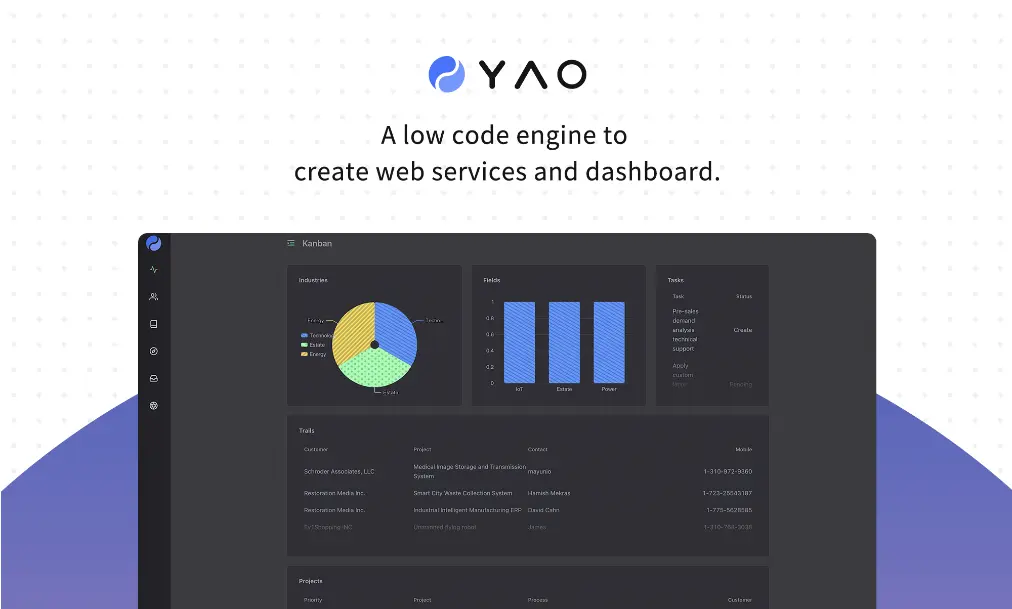 Yao 是一個只需使用 JSON 即可創建數據庫模型、編寫 API 接口、描述管理後台界面的低代碼引擎,使用 Yao 構建的應用可運行在雲端或物聯網設備上。 開發者不需要寫一行代碼,就可以擁有 10 倍生產力。