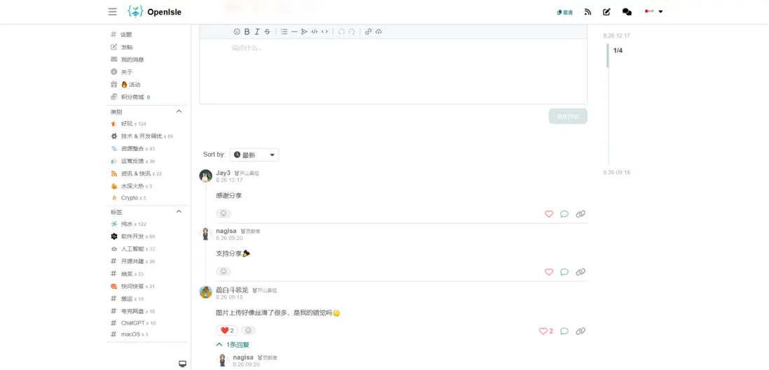• 豐富的內容管理:支持分類、標籤的貼文管理以及草稿保存功能;支持嵌套評論、指定貼文或評論的點贊/抖彈系統;集成 OpenAI 提供的 Markdown 格式化功能