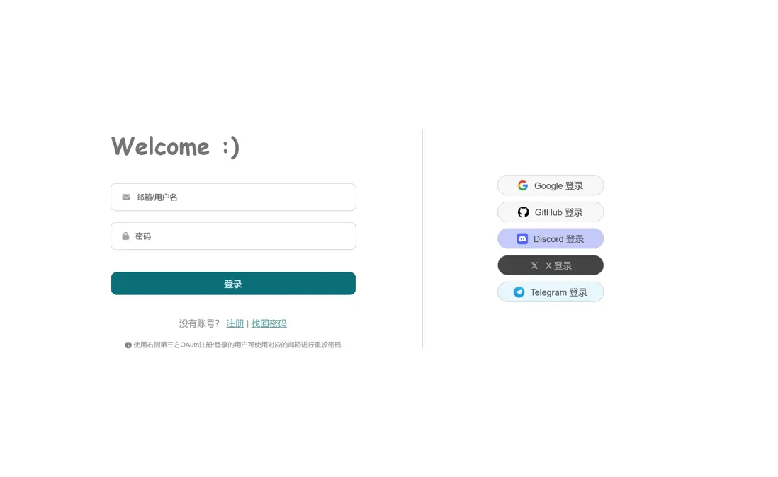• 靈活的登錄體系:支持 JWT 認證及 Google、GitHub、Discord 等多平台 OAuth 登錄,可通過環境變量可調整密碼強度、登錄方式、保護碼等多種配置,兼顧安全性與便捷性
