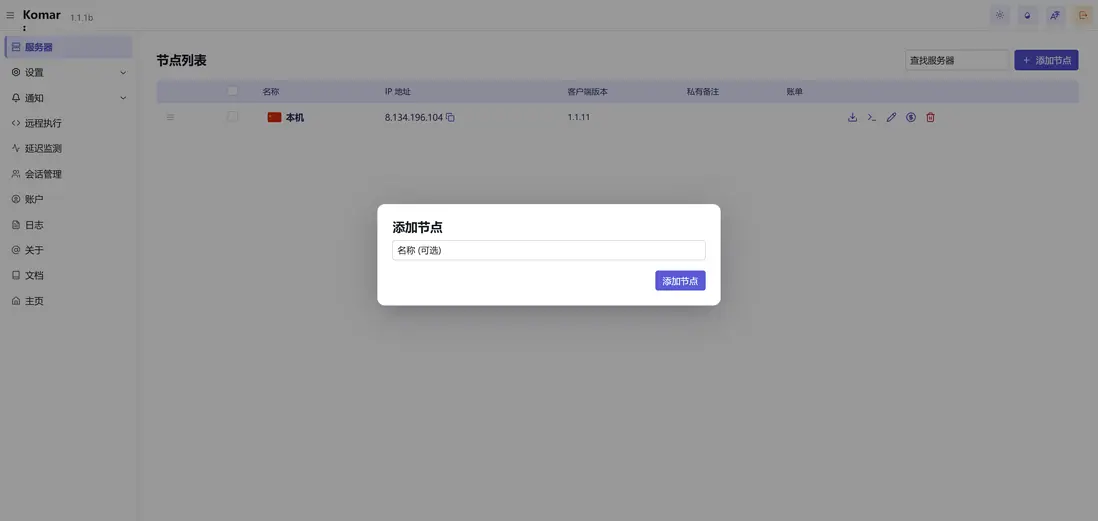 1、訪問 Komari 服務後台管理,打開服務器菜單頁面,點擊添加節點,輸入節點名稱並保存