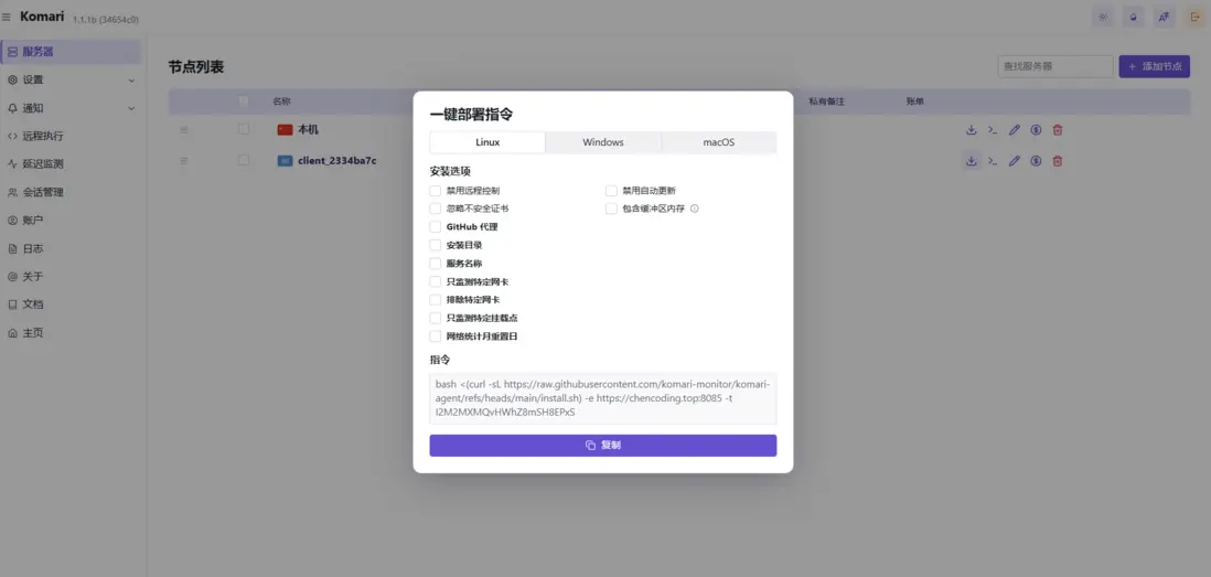 2、在剛添加的節點信息項目中,點擊一鍵部署指令圖標,獲取 Komari Agent 部署指令