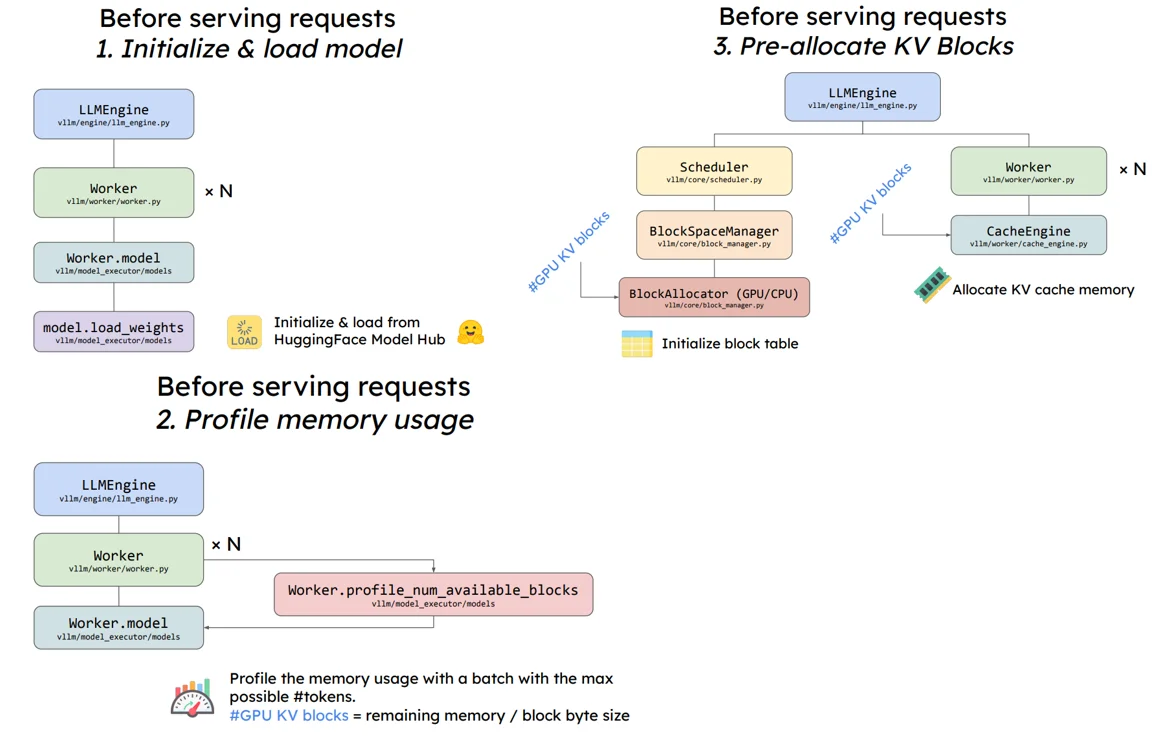 在模型進行輸出之前主要是進行3步:1、初始化並且加載模型;2、預分配顯存過程;3、將預分配的KV Cache加載到gpu上。