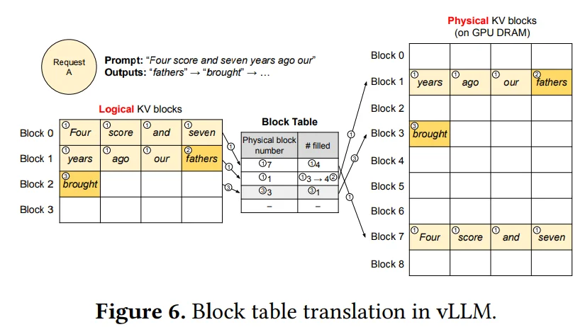 上述過程描述如下:具體而言,Page Attention 首先將 Key/Value 的連續顯存空間劃分為固定大小的 Block(頁),每個 Block 作為最小的內存分配與調度單元。隨後,引入一個 Block Table(頁表) 來維護邏輯序列位置與物理 Block 之間的映射關係,用於記錄每個 Block 當前的存儲狀態與可用容量。