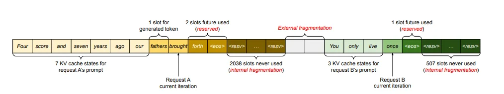 2、內部內存碎片化問題(internal memory fragmentation):系統會為每個請求預先分配一塊連續的內存空間,大小基於最大可能長度(比如2048個token),但實際請求長度往往遠小於最大長度,這導致預分配的內存有大量空間被浪費。