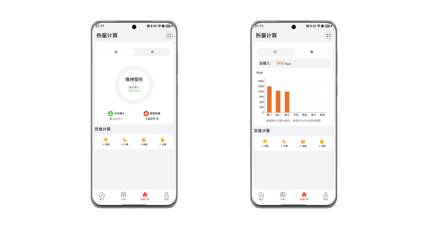 支持查看當日飲食熱量攝入情況,或者查看一週熱量攝入統計。