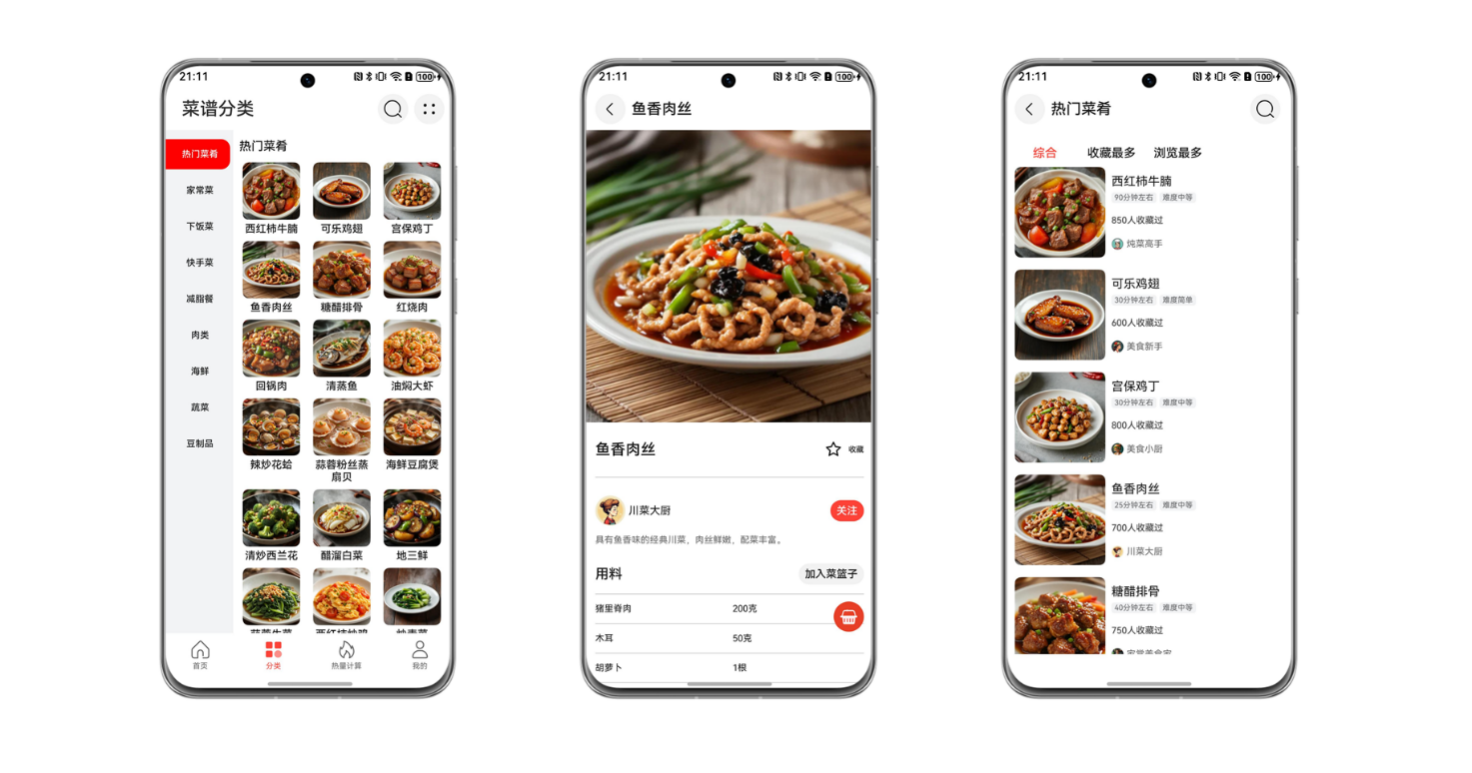 - 支持按菜譜分類展示和搜索菜譜,點擊菜譜可以查看菜譜詳細信息。