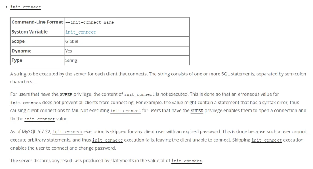 - 但是對具有SUPER權限用户,會忽略這個init_connect,不會執行其中的指令。