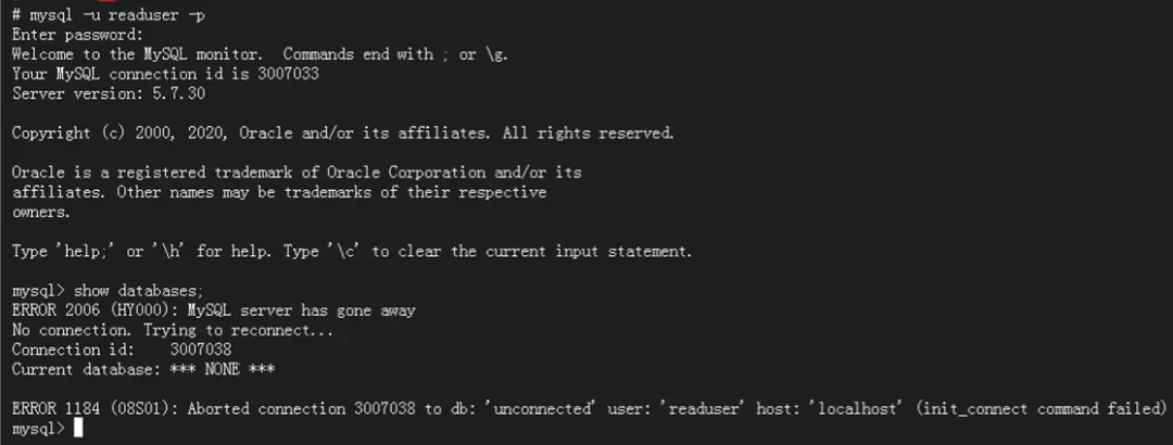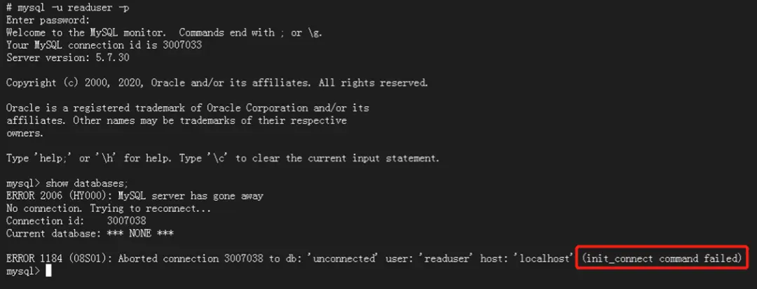- 如果init_connect中包含的語句存在語法錯誤,則會導致客户端連接失敗。