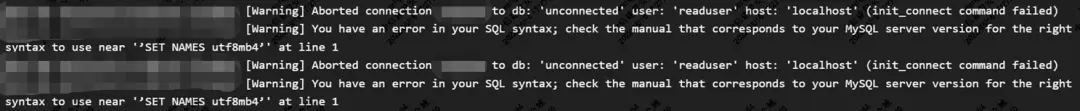 如上環境中init_connect設置的值是'SET NAMES utf8mb4',如果我們直接執行這個指令,提示存在語法上的錯誤,