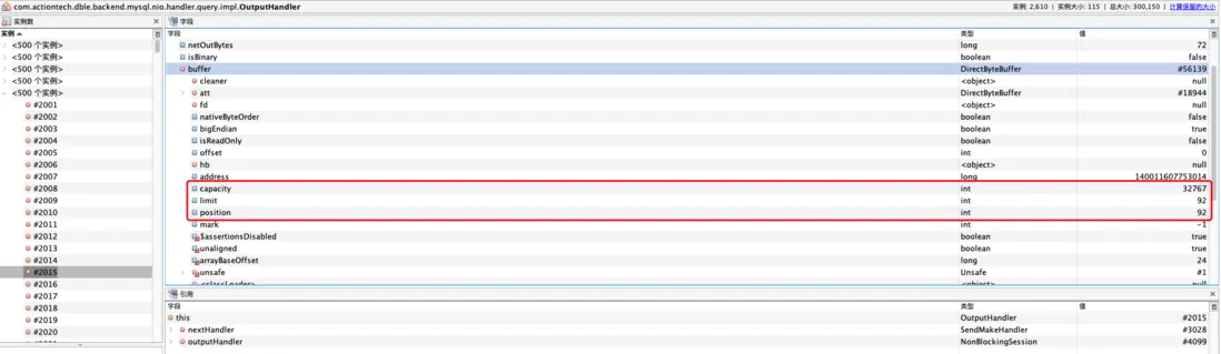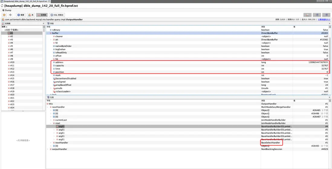 既然堆外內存泄露的比較快,平常狀態下的dump 文件中應該可以找到異常的沒有被回收的OutputHandler實例。