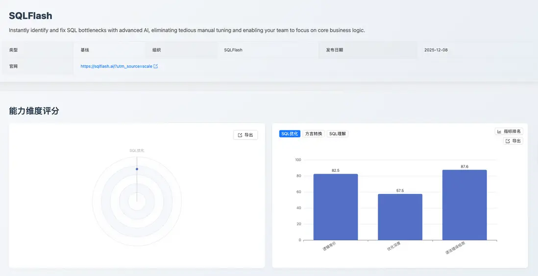 - 數據解讀:87.6 分的成績證明 SQLFlash 在高複雜度 SQL 輸入下,其輸出優化改寫後的 SQL 在語法結構和規範性上具備較高的可靠性。