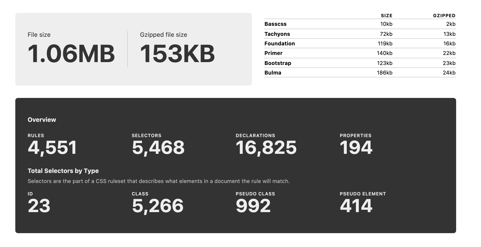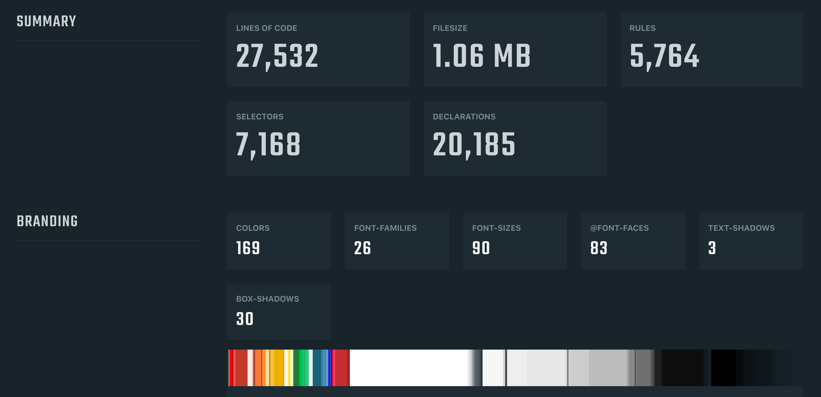 When doing a CSS audit or preparing for a CSS refactor, I rely on several of many useful tools to get a general overview and useful stats about the CSS codebase.