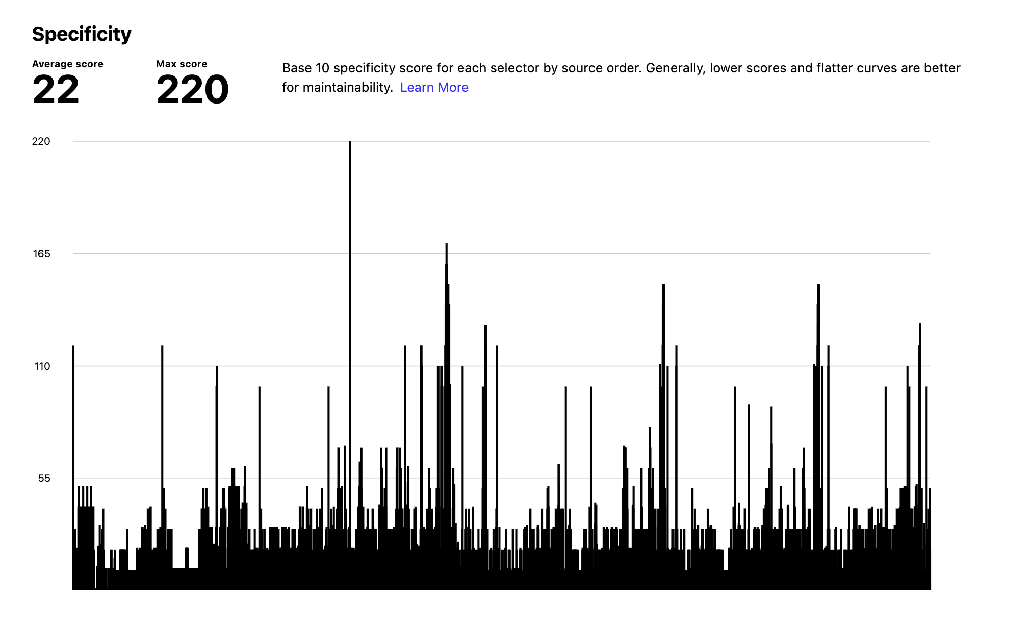 “A tool like CSS Stats can easily help you figure out consistency issues within your codebase. Indicating what can happen when everybody has different opinions on how a grey tone should look like, you will end up with 50 shades of grey. Moreover, Specificity Graph gives you a good overall indication of your CSS base’s health.”