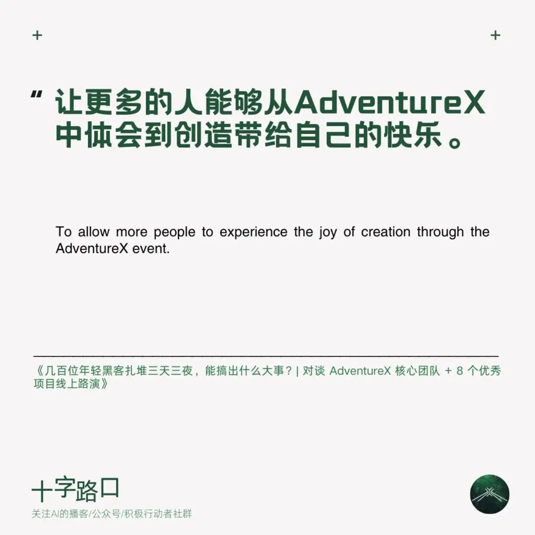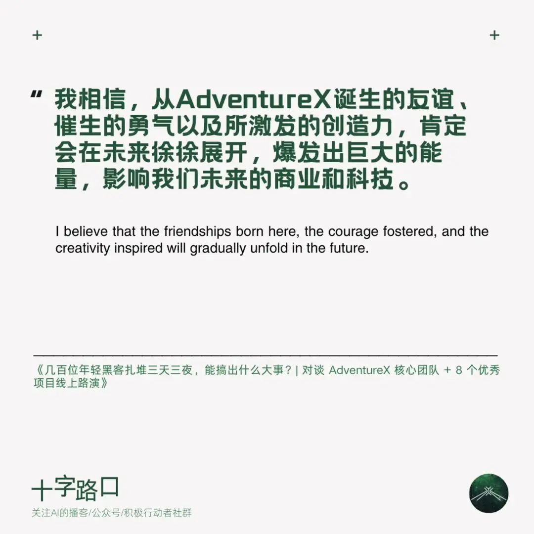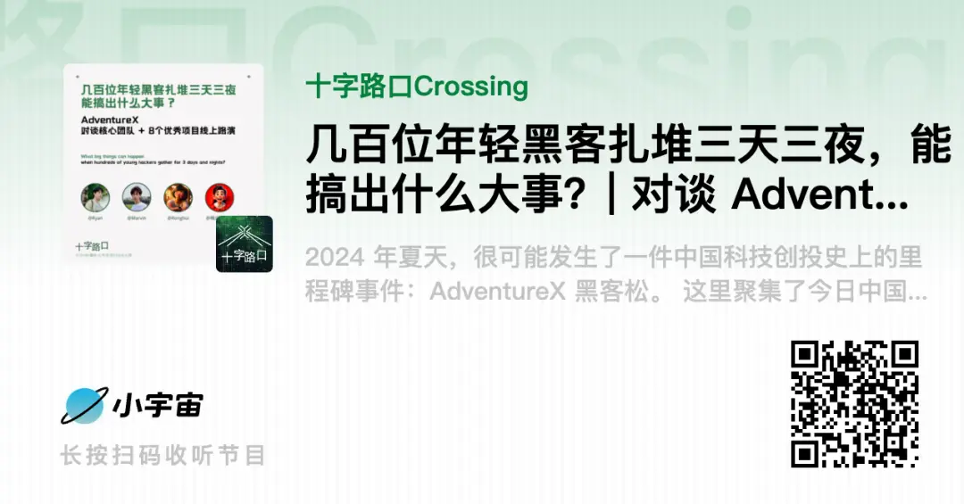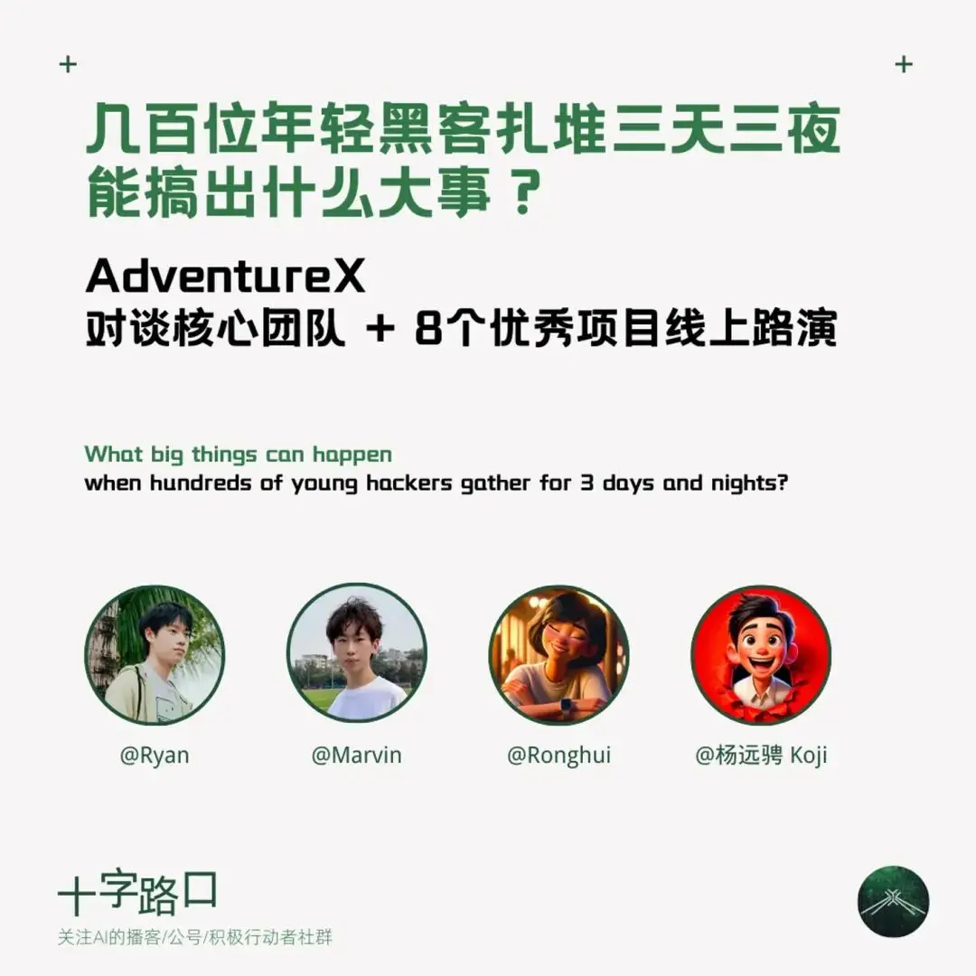 今天,「十字路口」迎來特殊嘉賓:兩名高中生。他們組織的 AdventureX 是一場前所未有的黑客鬆。由於限制了最大參加年齡為 26 歲,AdventureX 也被稱為「中國年輕人的第一場黑客鬆」。1200 多人報名,200 多人入選,大家齊聚杭州湖畔創研中心的一個封閉會堂,三天三夜,從 0 到 1 完成了 50 多個產品的創作開發。