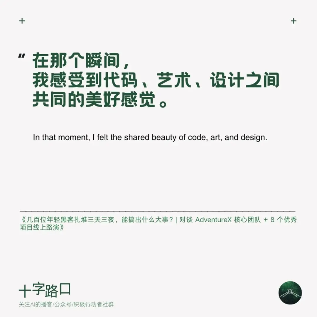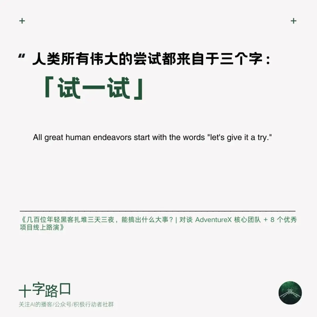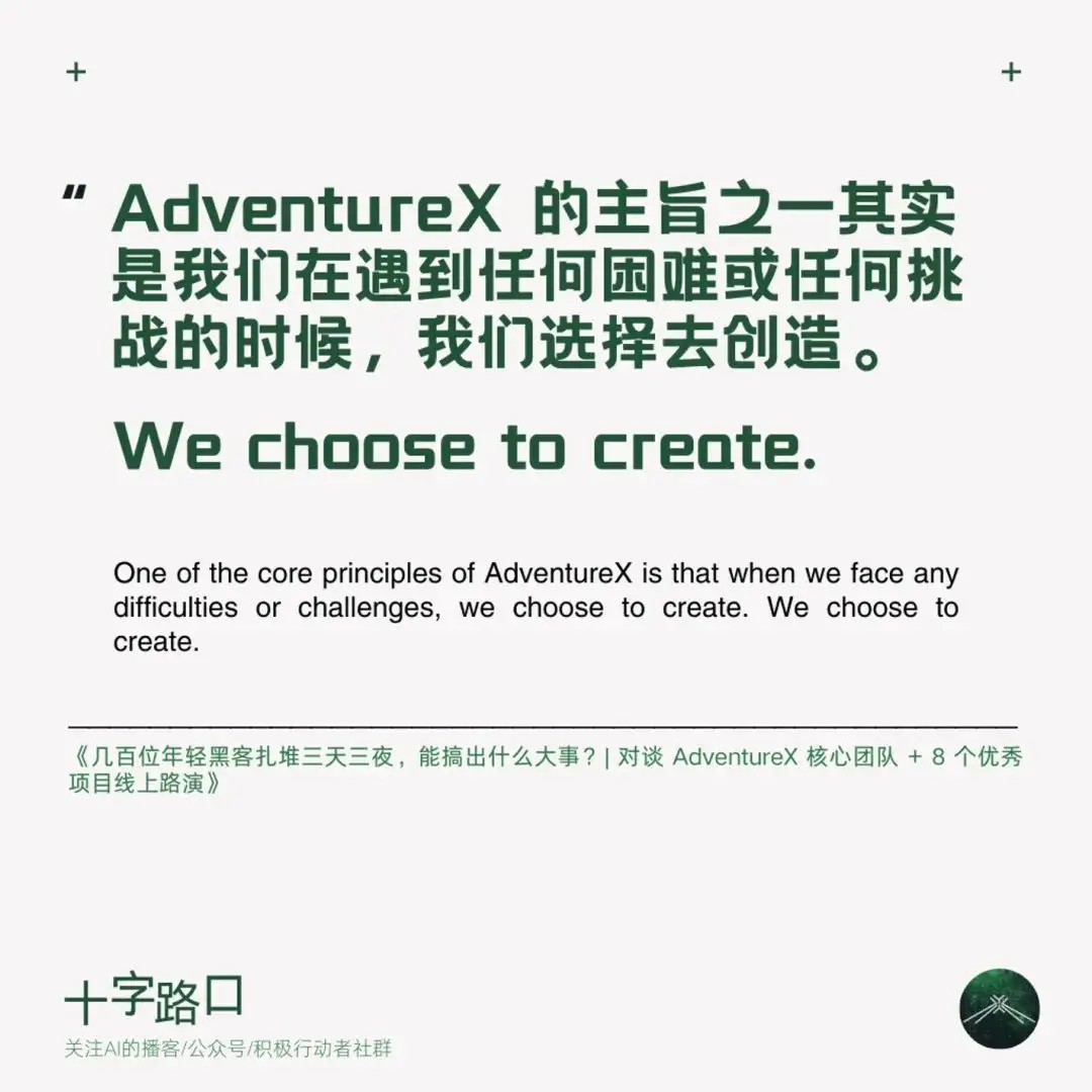 今天,「十字路口」迎來特殊嘉賓:兩名高中生。他們組織的 AdventureX 是一場前所未有的黑客鬆。由於限制了最大參加年齡為 26 歲,AdventureX 也被稱為「中國年輕人的第一場黑客鬆」。1200 多人報名,200 多人入選,大家齊聚杭州湖畔創研中心的一個封閉會堂,三天三夜,從 0 到 1 完成了 50 多個產品的創作開發。