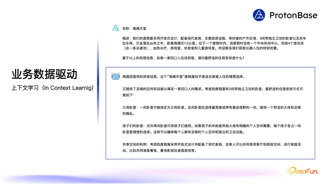 於是我們想利用大語言模型的能力來完成這樣一個規劃,把這個民宿的描述等信息給到大語言模型,然後再向大語言模型提問,請它安排家人的住宿。大家可以看到大語言模型在瞭解了這些信息之後,給出了一個非常合理的安排。這就是大語言模型一個核心的能力,它可以從上下文當中學習知識,並且把自己的智能應用在這些新學的知識上。