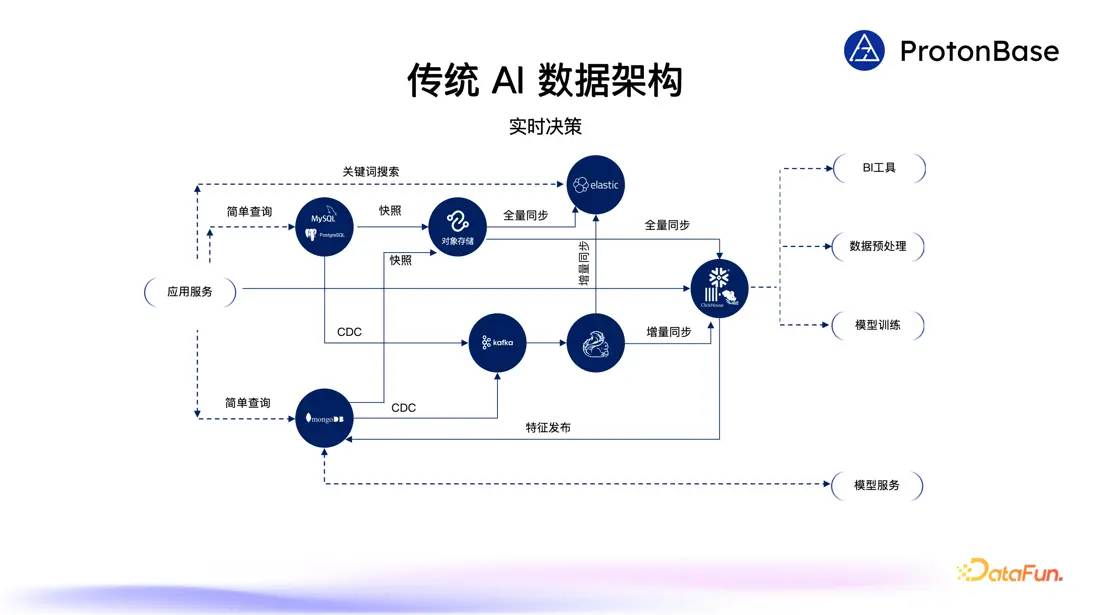 - 開發視角:構建這樣複雜的架構有較高的開發門檻,開發人員需要學習和理解多個不同的數據產品,每個數據產品都有一些侷限性,開發人員還需要理解和繞開這些問題。對很多中小公司來説,招聘大量優秀的數據和 AI 工程師是一大挑戰,從而導致很多數據的業務價值並沒有被完全挖掘出來。即使團隊很幸運擁有這些工程師,他們也需要把大量時間花在繁瑣的數據同步上,這無疑極大地降低了開發效率,降低了業務的迭代速度,阻礙了業務的發展。