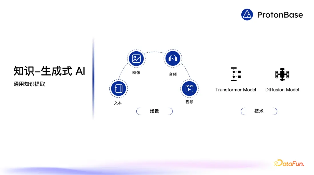 生成式 AI 的崛起,特別是基於 Transformer 架構的大語言模型在理解和生成文字,以及基於 Diffusion 的圖像模型生成圖像上取得了重大突破。生成式 AI 能生成高質量的文本甚至代碼,能夠通過文生圖、圖生圖的方式生成圖像,能夠通過文字生成音頻甚至視頻,這一系列能力不僅極大地拓寬了 AI 的使用場景,也在重新定義什麼是非結構化數據,它以一種全新的方式給傳統的非結構化數據賦予結構,從中提取知識。