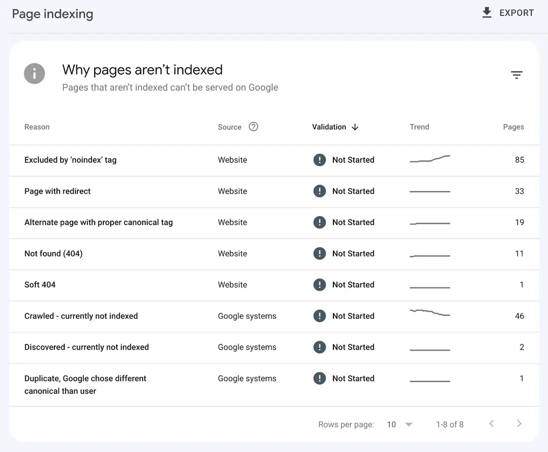 頁面索引報告顯示了Google可以找到和索引的頁面,以及任何相關問題。它包括: